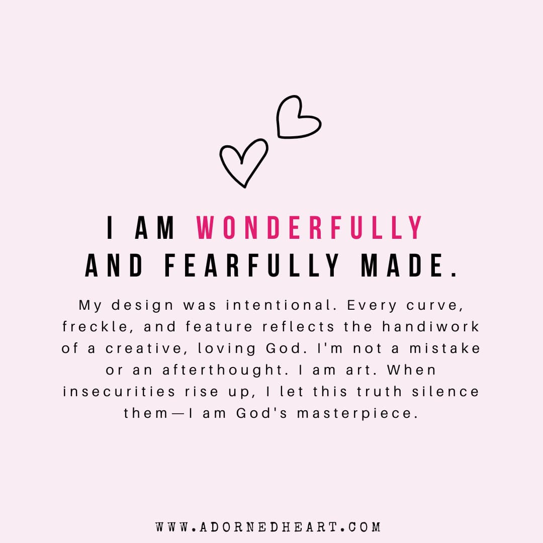 My design was intentional. Every curve, freckle, and feature reflects the handiwork of a creative, loving God. I’m not a mistake or an afterthought. I am art. When insecurities rise up, I let this truth silence them—I am God’s masterpiece.