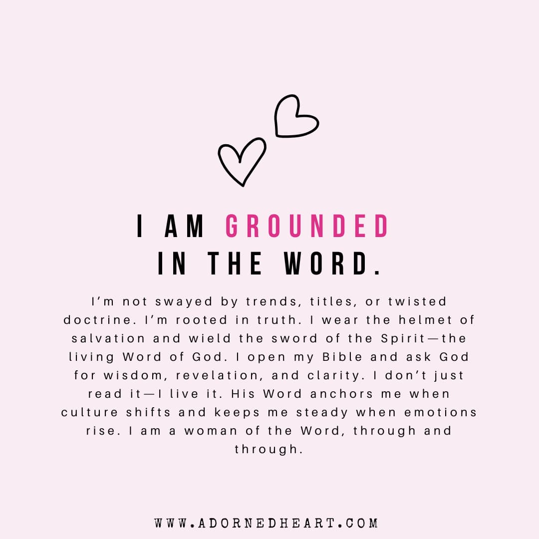 I’m not swayed by trends, titles, or twisted doctrine. I’m rooted in truth. I wear the helmet of salvation and wield the sword of the Spirit—the living Word of God. I open my Bible and ask God for wisdom, revelation, and clarity. I don’t just read it—I live it. His Word anchors me when culture shifts and keeps me steady when emotions rise. I am a woman of the Word, through and through.