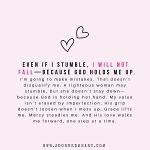 I’m going to make mistakes. That doesn’t disqualify me. A righteous woman may stumble, but she doesn’t stay down—because God is holding her hand. My value isn’t erased by imperfection. His grip doesn’t loosen when I mess up. Grace lifts me. Mercy steadies me. And His love walks me forward, one step at a time.