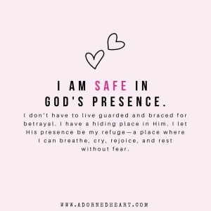 I don’t have to live guarded and braced for betrayal. I have a hiding place in Him. I let His presence be my refuge—a place where I can breathe, cry, rejoice, and rest without fear.